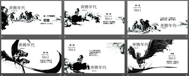 万马奔腾艺术PPT模板下载,关键词:马儿PPT背景图片,奔腾、奔跑的马主题幻灯片模板,黑白PPT背景,动态、动画PPT下载,国画、中国画、绘画艺术PPT模板下载,动物背景PPT模板下载,PPT格式;