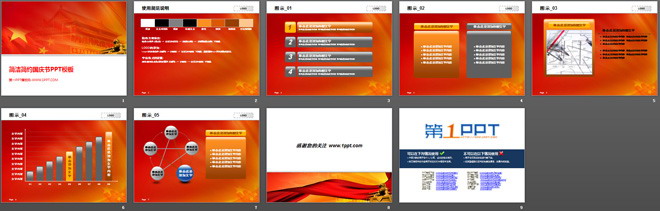 PPT模板封面使用了红色调,添加了五星红旗、天安门作为PPT背景图片,非常庄严、大气,模板内容在红黄背景之上添加了文本框、柱形图、目录等PPT图表背景素材,适合用来制作国庆节的PowerPoint。