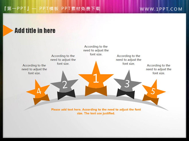 五个并排的五角星构成了PPT目录,中间的五角星稍大,两边的对等,本张PPT素材适合制作时尚类PowerPoint目录;