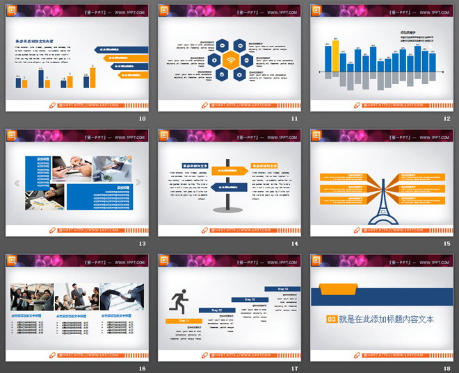 关键词:蓝橙组合幻灯片图表大全,扁平化年终工作总结PPT图表整套下载,.PPTX格式;