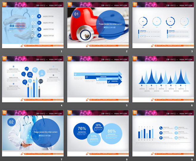 关键词:蓝色扁平化PPT图表整套下载,医疗行业幻灯片图表大全,医院年终工作总结PPT图表免费下载,.PPTX格式;