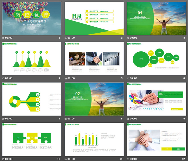 关键词:天空、彩色气球幻灯片背景图片,绿色扁平化幻灯片图表大全,动态个人竞聘PPT模板、岗位竞聘PowerPoint模板,.PPTX格式;