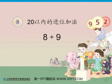 《20以内的进位加法》例题PPT课件 本课件通过形象的图型讲解帮助学生解决例题中的难点、疑点,生动有趣的展示了《20以内的进位加法》的例题部分的教学内容,帮助老师更好的完成本课的教学,是很好的人教版小学一年级上册数学教..