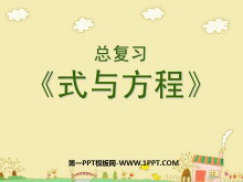 《式与方程》总复习PPT课件 ①含有字母的式子: a+b、a-486、8X等 ②不等式: 3+5>7、1+3<5、5a-40>16等 ③等式: 例如:1+2=3、99+1=100、4X=24、8x-4.8x=1.6 等 ④方程: 4X=24、8x-4.8x=1.6等。 ... ... ... 练习与实践 ..
